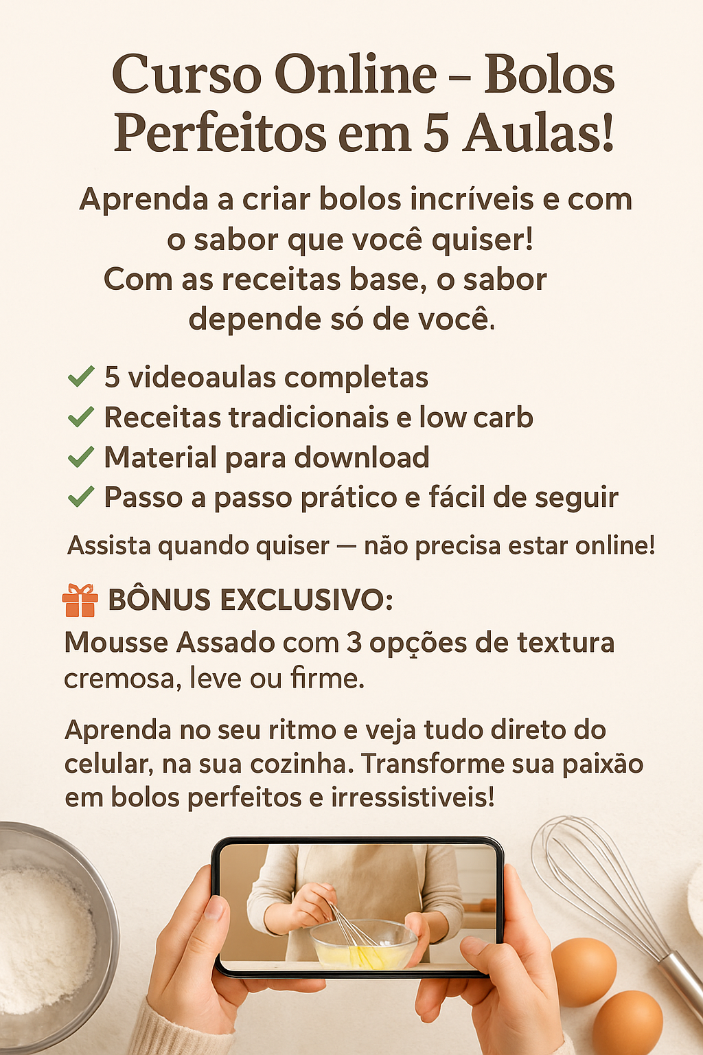 As aulas são enviadas diretamente para você em vídeo, e você pode assistir quando e quantas vezes quiser, no seu ritmo e no horário que for mais conveniente.2. Preciso ter experiência na cozinha para acompanhar as aulas?